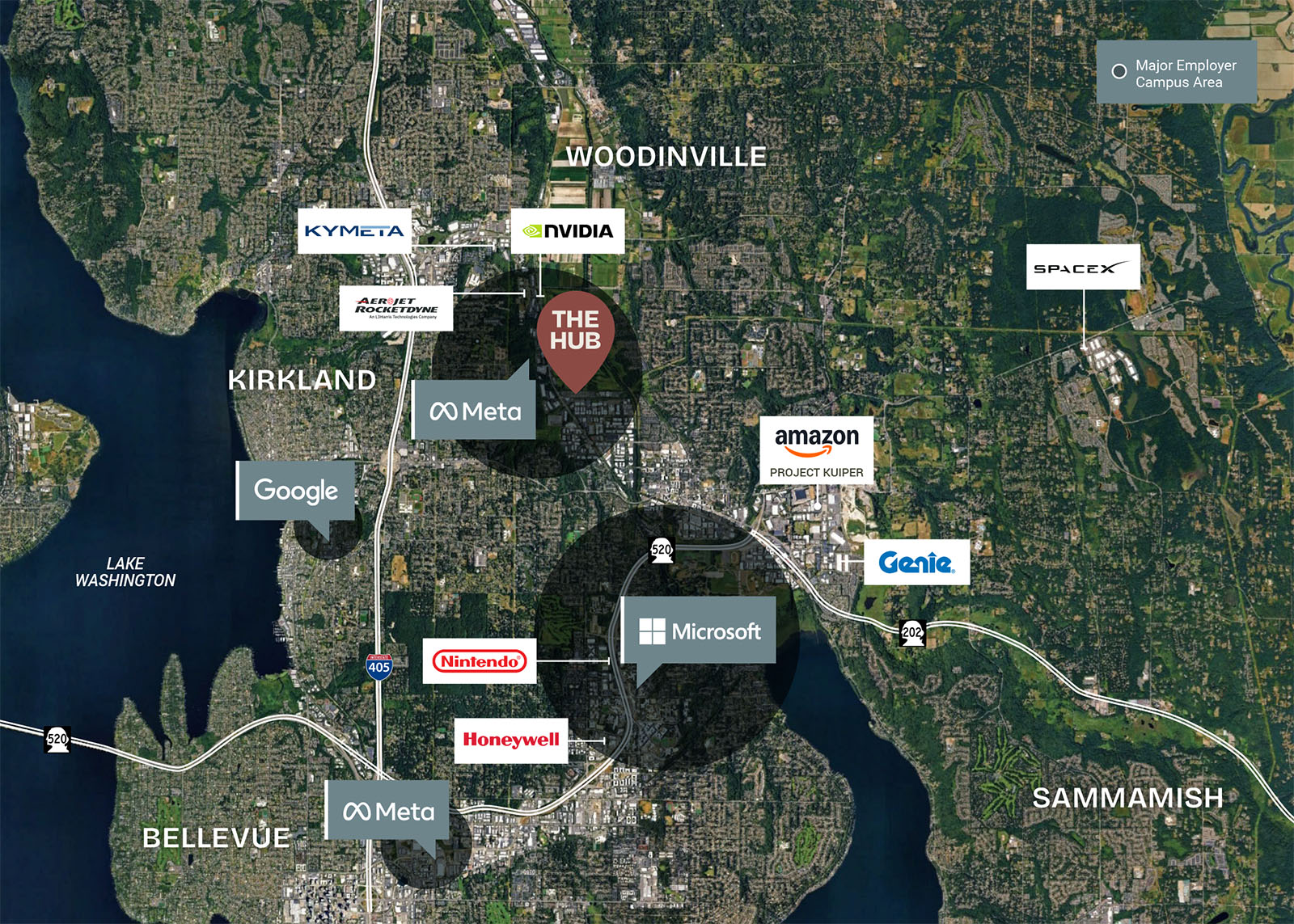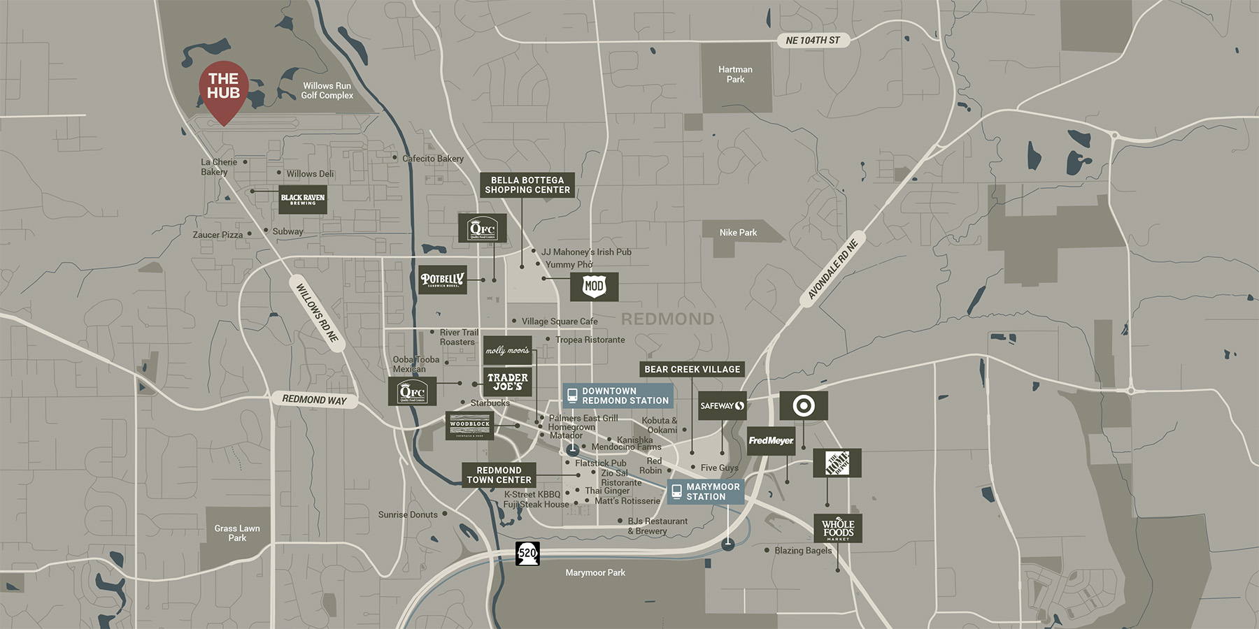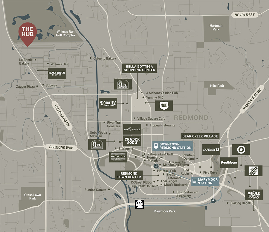 The Hub is located in Redmond, with two direct entrances off Willows Road— one of which is a dedicated, lit intersection. The property is bordered by Willows Run Golf Complex to the north and a nature trail to the south, directly connected to the Sammamish River trail system via pedestrian bridge. Minutes from downtown Redmond, Redmond Town Center, the new Light Rail Transit Center, plus a multitude of easy transit routes, amenities, and residential communities.