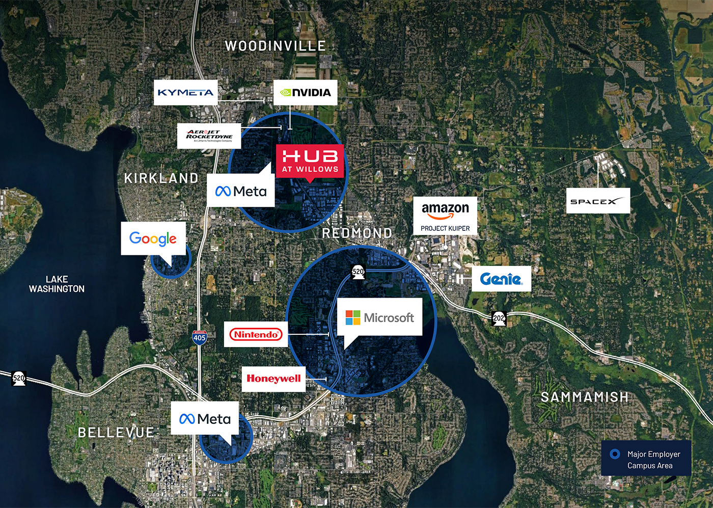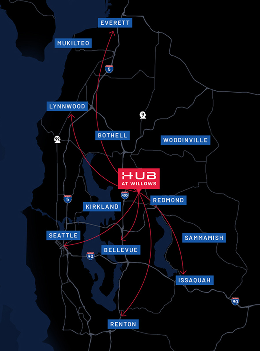 The Hub is located in Redmond, with two direct entrances off Willows Road— one of which is a dedicated, lit intersection. The property is bordered by Willows Run Golf Complex to the north and a nature trail to the south, directly connected to the Sammamish River trail system via pedestrian bridge. Minutes from downtown Redmond, Redmond Town Center, the new Light Rail Transit Center, plus a multitude of easy transit routes, amenities, and residential communities.